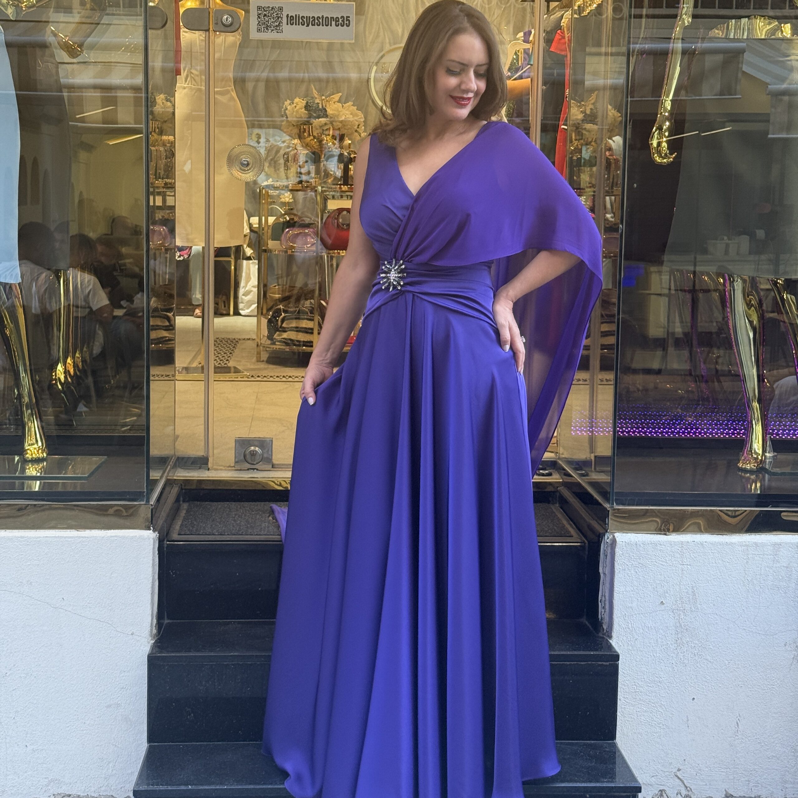 Şifon Pelerinli Saten Abiye